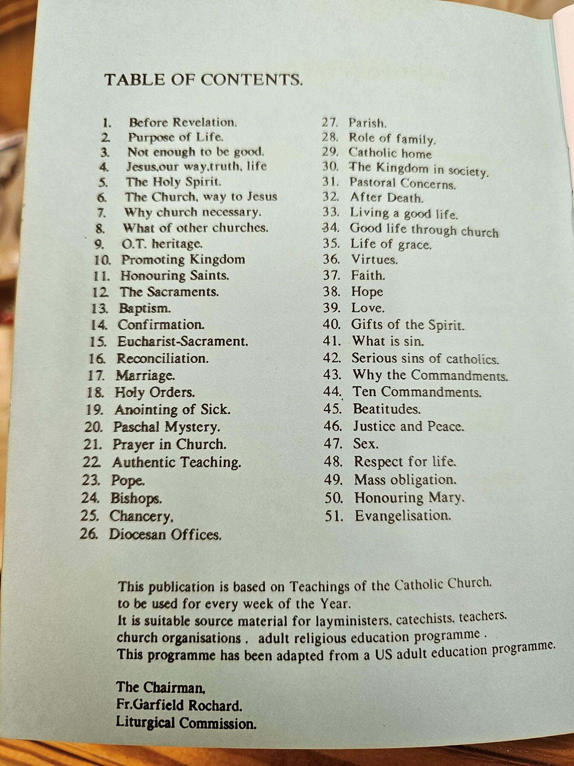 This comprehensive catechetical resource, adapted from a U.S. adult education program and approved by the Liturgical Commission, provides weekly reflections for an entire year on the core teachings of the Catholic faith. Covering over 50 topics—from the Sacraments, prayer, and Scripture, to family life, virtues, and evangelization—it offers a systematic way to grow in knowledge and practice of the faith.